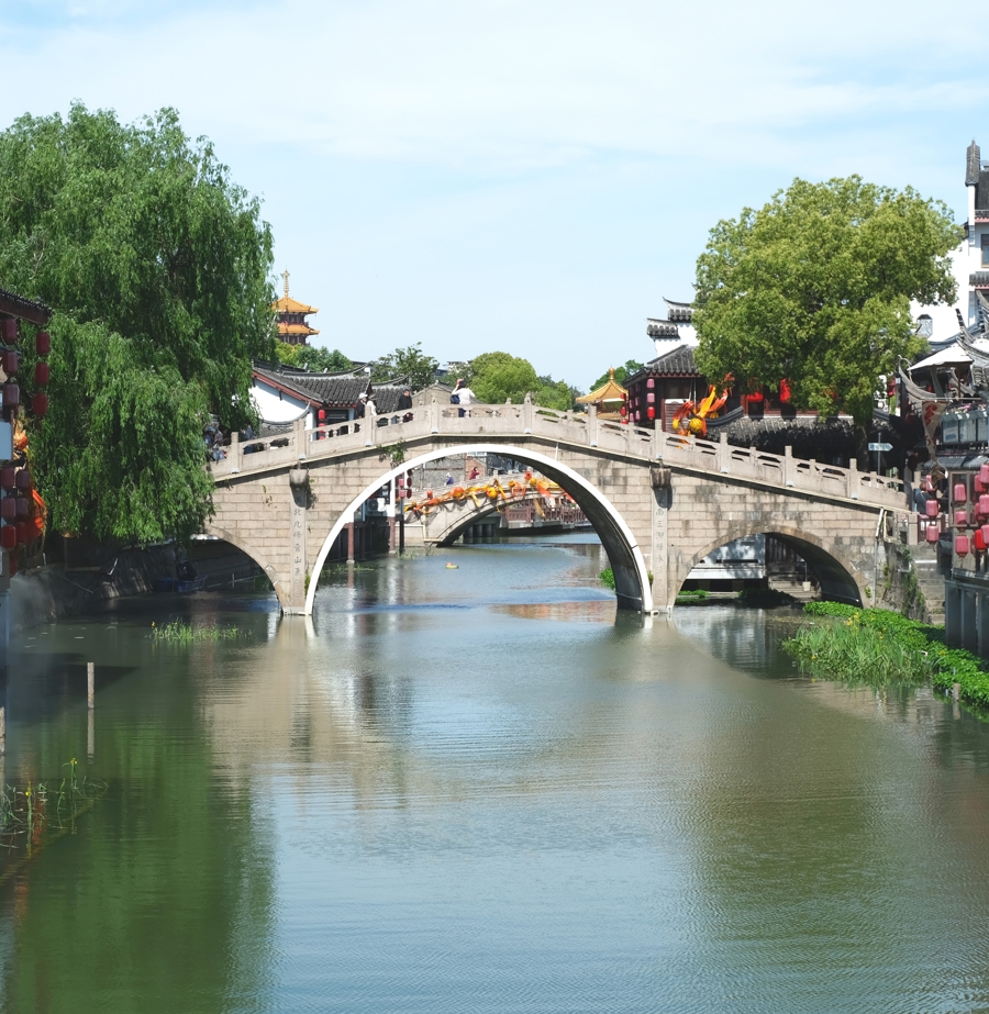 宝山罗店的大通桥始建于明成化八年(1472年),是一座造型秀美的半圆环石拱桥。它横跨罗店市河,因旧时桥上建有亭子,成为上海为数不多的古亭子桥。历经五百余年风雨,至今仍是宝山区现存最古老的拱桥之一,古韵犹存。
